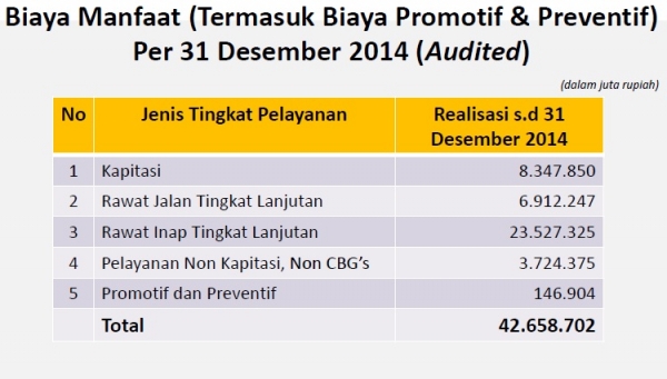 Sedangkan realisasi biaya manfaat berupa biaya pelayanan kesehatan perorangan (meliputi biaya promotif, preventif, kuratif dan rehabilitative) sampai dengan 31 Desember 2014 mencapai Rp 42,65 triliun.