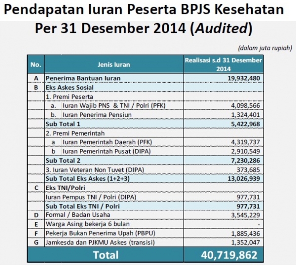 Sampai dengan 31 Desember2014, pendapatan iuran BPJS Kesehatan mencapai Rp 40,72 triliun, yang bersumber dari Pemerintah,Pemberi Kerja dan Pekerja serta kelompok Peserta Bukan Penerima Upah.