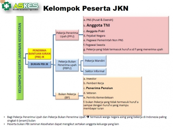 Sesuai dengan Perpres no 12/2013 tentang Jaminan Kesehatan,untuk kepesertaannya terbagi 2 macam yaitu Penerima Bantuan Iuran (PBI) yang terdiri dari fakir miskin dan masyarakat tidak mampu dan Bukan PBI yang terdiri dari pekerja penerima upah,pekerja bukan penerima upah dan bukan pekerja termasuk WNA yang bekerja di Indonesia paling singkat selama 6 bulan.